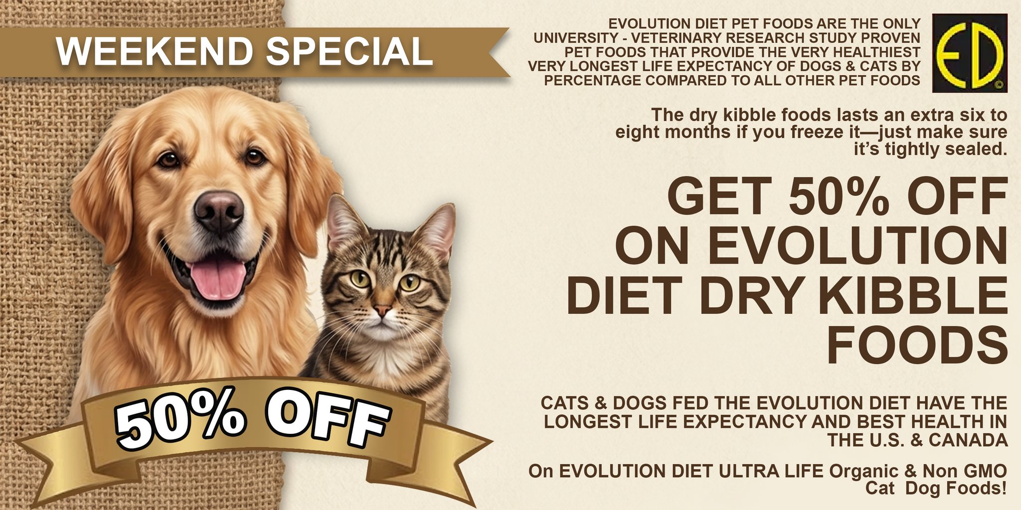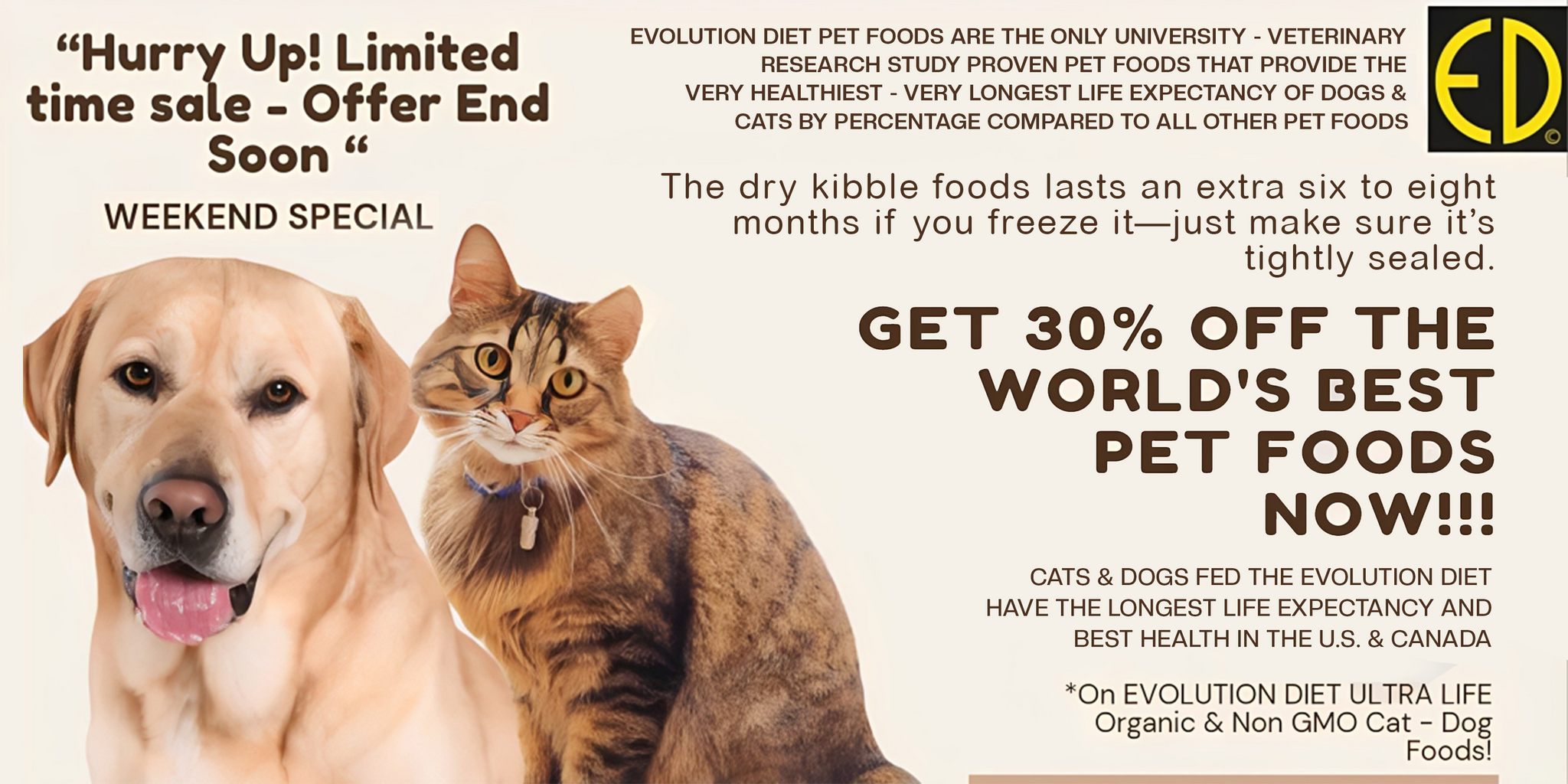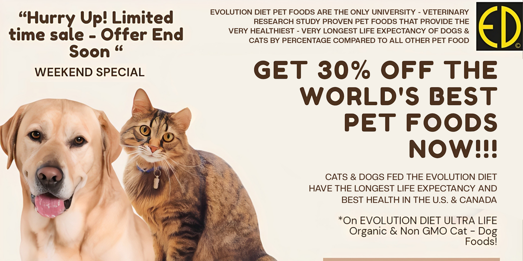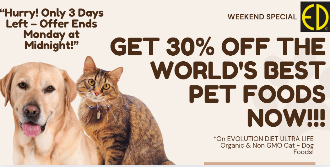 EVOLUTION DIETORGANIC AND NON GMO NO TOXIC CHEMICAL PRESERVATIVE PET FOODS DELICIOUS ORGANIC & NON GMO CHEESY TASTE. EVOLUTION DIET FED CATS & DOGS ARE THE HIGHEST PERCENTAGE OF PETS LIVING TO OVER 20 HUMAN YEARS OF AGE IN GOOD HEALTH. LOWEST REQUIREMENT FOR VETERINARY CARE ACCORDING TO INTERNATIONAL UNIVERSITY STUDY!